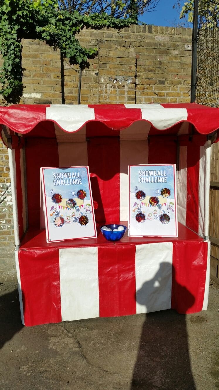 A fantastic fun game for all ages to play. Snowball Challenge Side Stall Hire A great Christmas Side Stall Game. 2 players compete to see how many snowballs they can get through the holes to get the highest score.