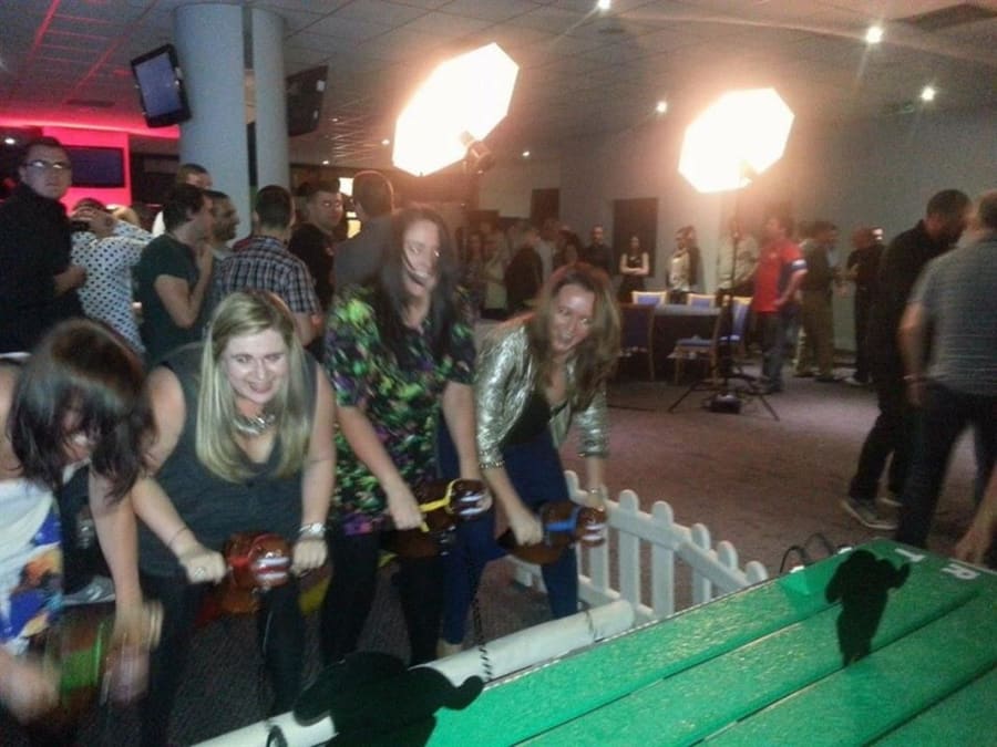 It’s a game for 4 players. The Horse Racing Simulator Hire There are 4 hobby horse's each being a different colour, red, blue, yellow & green. Each player has to put the hobby horse between their legs just above their knees, and hold onto the handles provided on either side of the horses head. Using the hobby horse, each rider has to simulate being a jockey on a horse using a circular motion, and the fast they do it the quicker their horse will move up the track to the finishing post. The game will be supplied with authentic race horse commentary which will add to the fun of the evening.