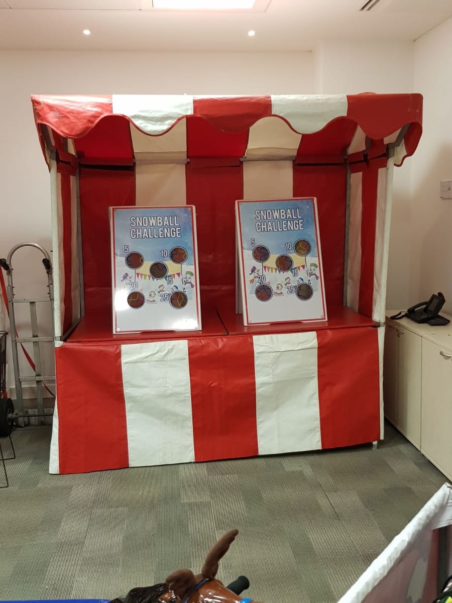 A fantastic fun game for all ages to play. Snowball Challenge Side Stall Hire A great Christmas Side Stall Game. 2 players compete to see how many snowballs they can get through the holes to get the highest score.