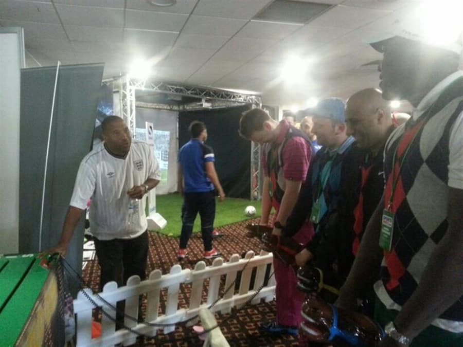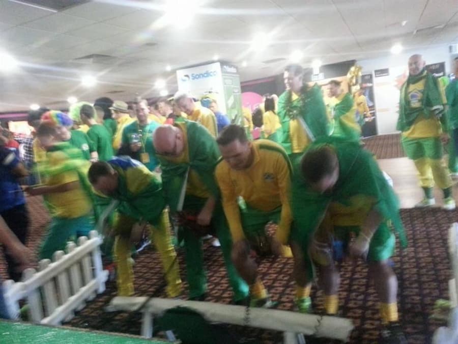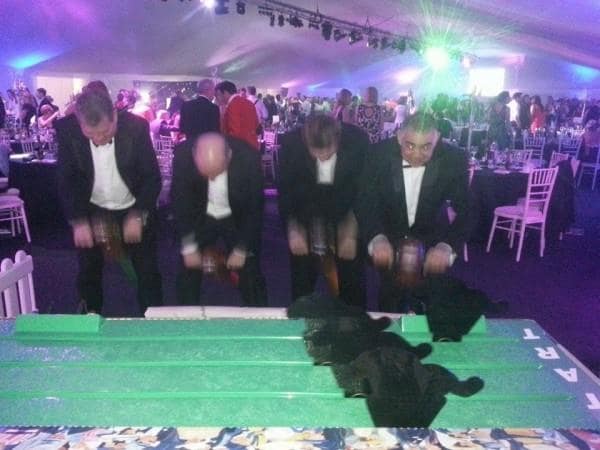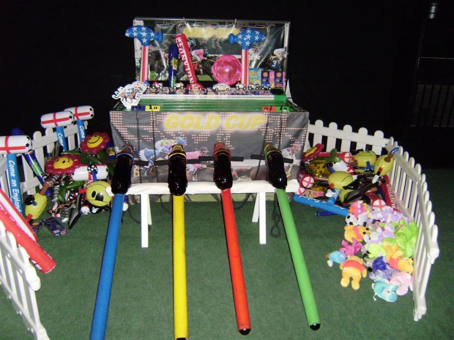 It’s a game for 4 players. The Horse Racing Simulator Hire There are 4 hobby horse's each being a different colour, red, blue, yellow & green. Each player has to put the hobby horse between their legs just above their knees, and hold onto the handles provided on either side of the horses head. Using the hobby horse, each rider has to simulate being a jockey on a horse using a circular motion, and the fast they do it the quicker their horse will move up the track to the finishing post. The game will be supplied with authentic race horse commentary which will add to the fun of the evening.